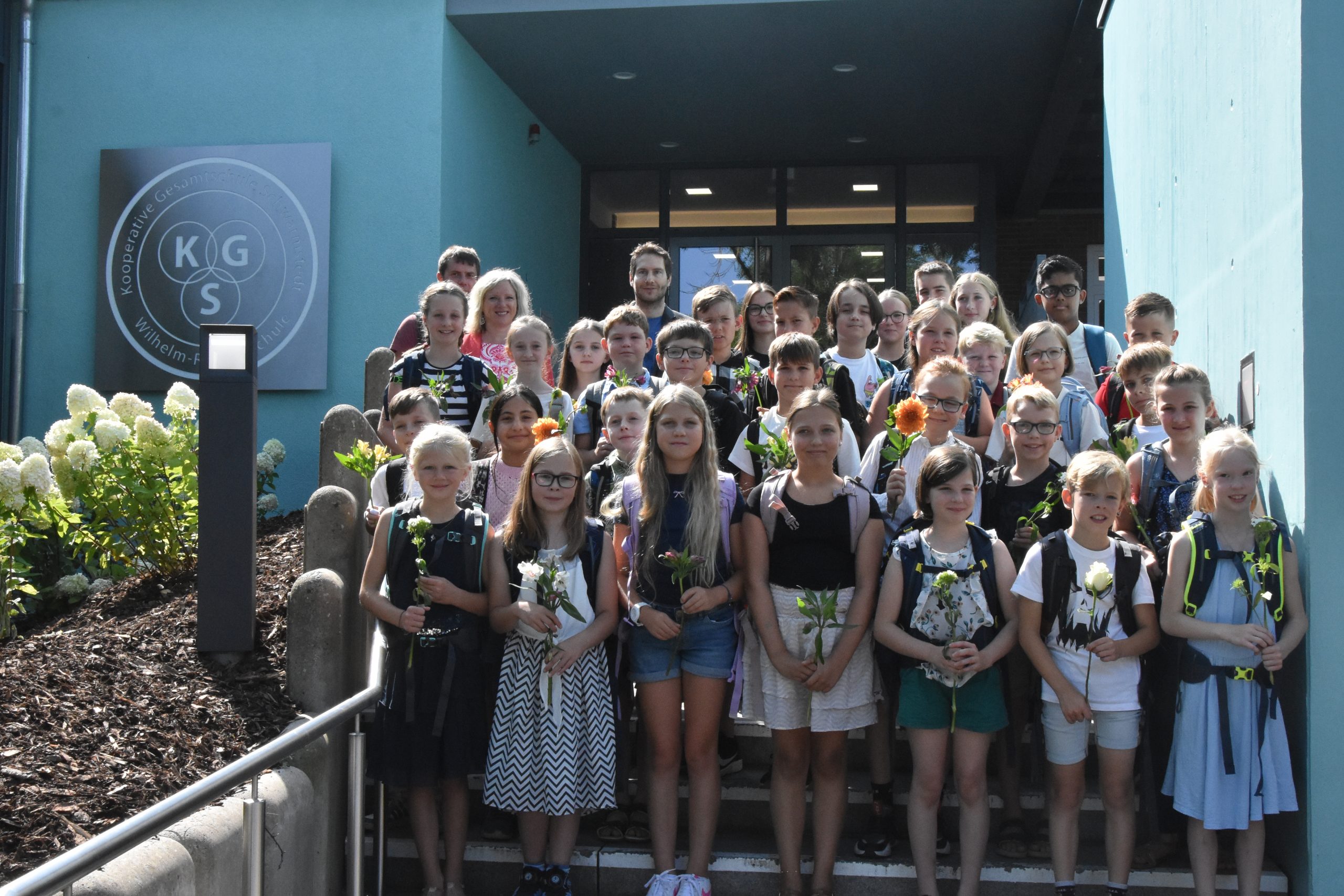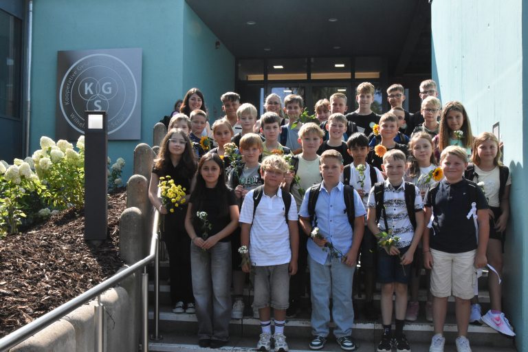 Die Größe des Musikbereichs wurde dann auch gleich zu Beginn deutlich gemacht, starteten die Bigband unter der Leitung von Herrn Rübke gemeinsam mit den Sängerinnen aus den AGs von Frau Dumke, Frau Weymann und Frau Bauer. Ein Riesenapplaus war den Künstlerinnen und Künstlern nach diesem fulminanten Auftritt sicher. Wie seit Jahren üblich begrüßten anschließend Moderatorenkinder aus den 6. Klassen die Neuankömmlinge, um gleich ein Vertrauen in die neue Umgebung aufzubauen. Damian Direk, Elias Mann, Leonie Melichar, Luisa Niedzwiedzinski, Hannah Otte, Lezgin Osso, Elisabeth Pape, Lotta Plagemann und Amelia Szafran waren von der Didaktischen Leiterin Maren Engel, die die Feier in bewährter Weise geleitet hat, perfekt vorbereitet und machten ihre Sache hervorragend. Die Neulinge fühlten sich gleich ein bisschen zu Hause, waren die meisten ja auch bereits am Schnuppertag vor den Sommerferien in der KGS gewesen. Beim Vorstellen der Schule liefen im Hintergrund auf großer Leinwand Fotos von den Ereignissen des vergangenen Schuljahrs, auf die sich die Neuen freuen können. Nach der Begrüßung durch Gesamtschuldirektor Tjark Ommen, der auch gleich die weiteren Schulleitungsmitglieder vorstellte, überbrachten Samtgemeindebürgermeister Björn Gehrs im ersten Durchgang und die stellvertretende Landrätin Claudia Schiesgeries im zweiten Durchgang die Grußworte von Politik und Verwaltung. Anschließend stellten die Moderatorenkinder die Sozialpädagogen Christian Biringer und Ole Sundermann und die Beratungslehrerin Katharina te Kock vor, die den Kindern bei Problemen zur Seite stehen. Von der Schülervertretung begrüßten im ersten Durchgang Lara Schmidt und im zweiten Durchgang Lara Nagel die neuen Schulmitglieder und ermunterten sie, in der SV mitzuarbeiten. Die Elternvertreterin Frau Hansen begrüßte bei beiden Veranstaltungen und ermunterte ihrerseits die Eltern, sich im Schulelternrat zu engagieren. Nach einem toll vorgetragenen Musikstück der Schulband unter der Leitung von Herrn Kaluza, verabschiedeten sich die Moderatorenkinder und die Klassenlehrkräfte riefen die Kinder auf, die in ihre Klasse gehen, und gemeinsam machte man sich auf den Weg in die neuen Klassenräume. Vorher wurde auf der Schultreppe noch ein erstes Klassenfoto vom FSJler Thore Gläser gemacht – eine Erinnerung an diesen tollen Tag.