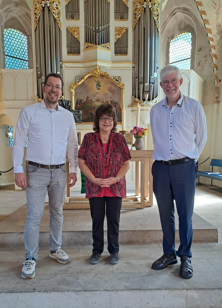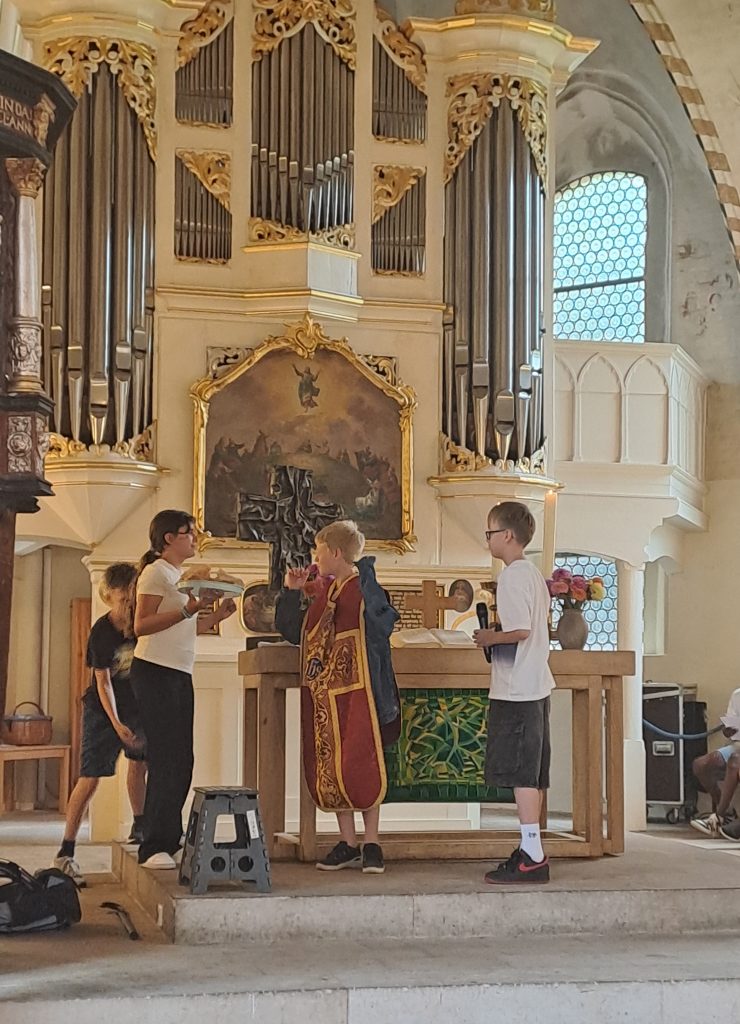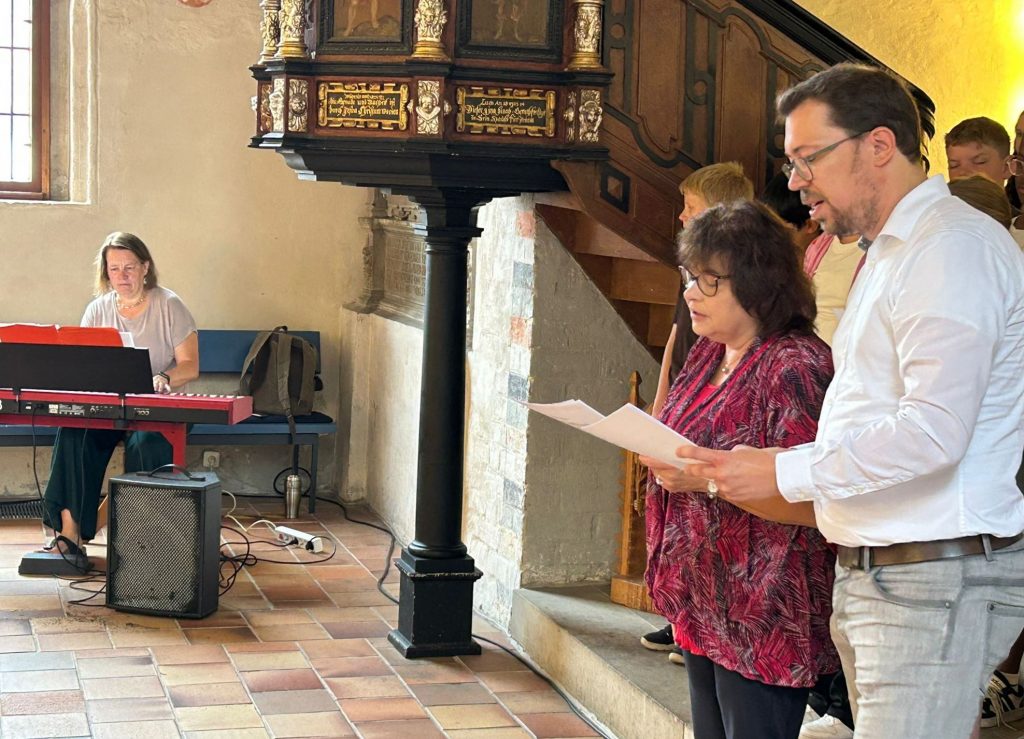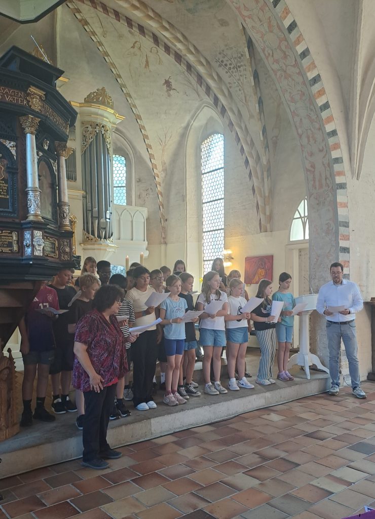 In diesem Jahr gab es an der Wilhelm-Röpke-Schule in Schwarmstedt so viele Anmeldungen wie noch nie. Die Arbeit der KGS bewirkt jedes Jahr aufs Neue auch Anmeldungen von außerhalb und ausnahmsweise musste in diesem Jahr nicht gelost werden, alle durften kommen. Um trotzdem allen Angehörigen, die es wünschen, die Möglichkeit zu geben, an der Einschulungsfeier teilzunehmen, teilte die Schulleitung die Feier auf und machte zwei daraus. Ein besonderer Aufwand für einen besonderen Tag. Da vor den Einschulungsfeiern traditionsgemäß ein Einschulungsgottesdienst stattfindet, planten die Religionslehrkräfte Claudia Knobbe, Maike Blum und Matthias Wehrung gemeinsam mit Schulpastor Michael Habel und mit Xenia Zorn ebenfalls zwei Gottesdienste. Für insgesamt 9 Schulklassen fand ein Gottesdienst um 9.15 Uhr und ein zweiter um11.30 Uhr statt; die Familien waren im Vorfeld informiert worden, wann sie an der Reihe sind. Am 1. Schultag nach den Sommerferien galt es deshalb für beide Veranstaltungen zu üben, denn wie an der KGS üblich, waren viele Schüler:innen der höheren Klassen mit dabei, um die Neuankömmlinge zu begrüßen. Die Schwarmstedter Kirchengemeinde hatte wie in den Vorjahren die St. Laurentiuskirche zur Verfügung gestellt und einige Schüler:innen pendelten für die Proben zwischen Mensa und Kirche hin und her. So waren am Projektchor insgesamt 26 Schüler:innen aus den Klassen 9G1, 6G2 und 6G3 beteiligt. Einige dieser Schüler:innen trugen auch Texte und Gebete vor, die zum Mitdenken anregten.