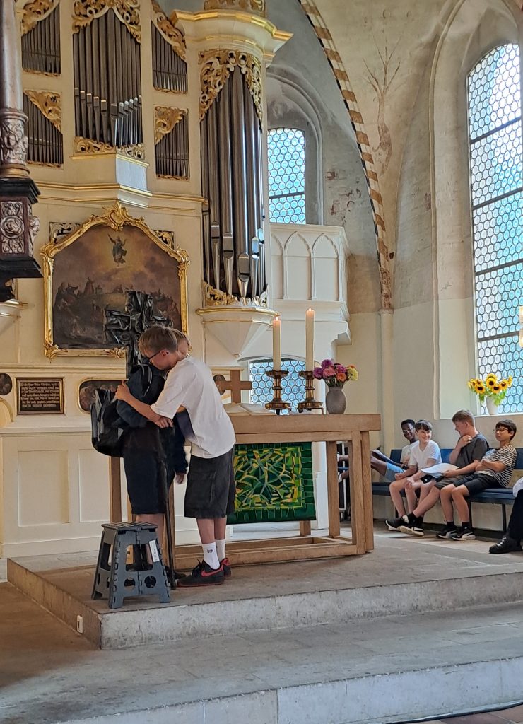 Ein kleines von Claudia Knobbe geschriebenes an das Lukasevangelium angelehntes Theaterstück zum verlorenen Sohn zeigte eindrucksvoll die Begabungen der Schüler:innen. Gottes Liebe ermöglicht uns immer wieder Neuanfänge, so die Botschaft, die dann auch in der Predigt von Matthias Wehrung aufgegriffen wurde.