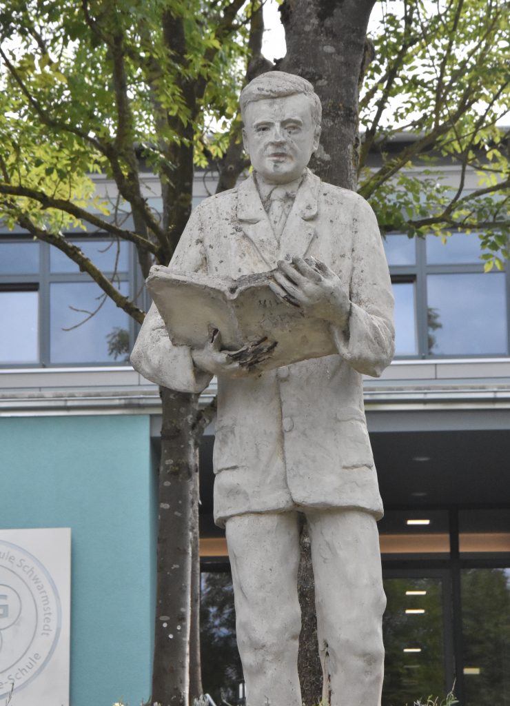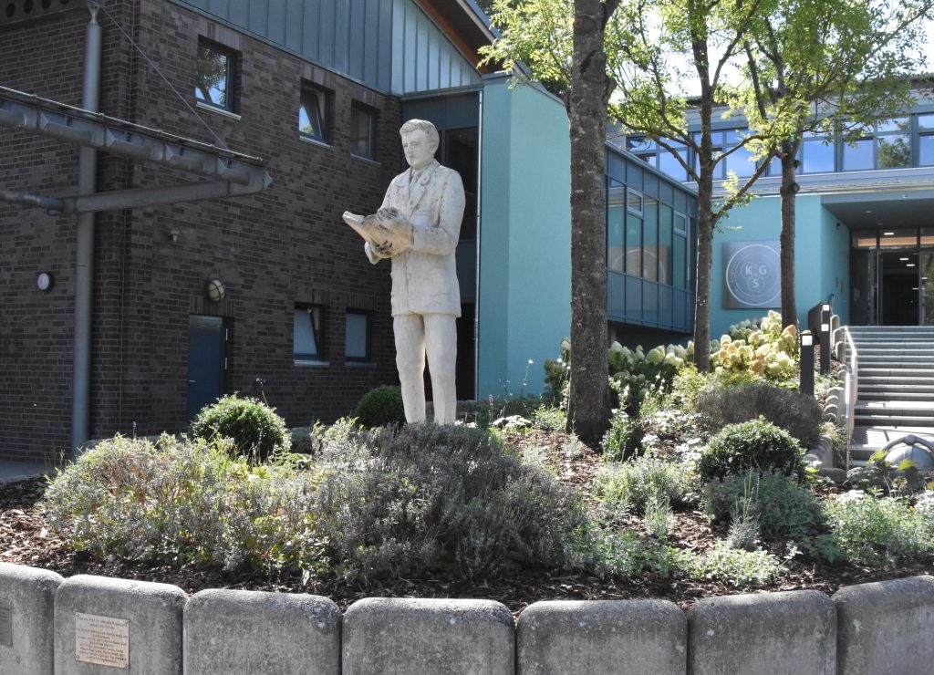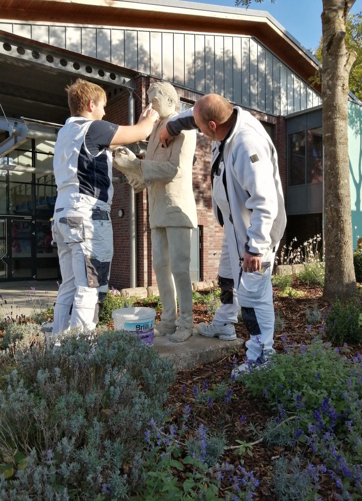 Die Statue von Wilhelm Röpke, die seit 2012 in diesem Beet steht und an den berühmten Namensgeber der Schule erinnert, war im Laufe der Jahre verschmutzt und leicht beschädigt. Sie wurde komplett repariert, ins besonders ein abgesplitterter Finger wurde ersetzt, dann gereinigt und es wurde eine neue Schutzschicht angebracht, damit Herr Röpke jetzt vor Wind und Wetter geschützt ist. Diese Arbeit wurde von der Firma „Hache“ aus Marklendorf erledigt.