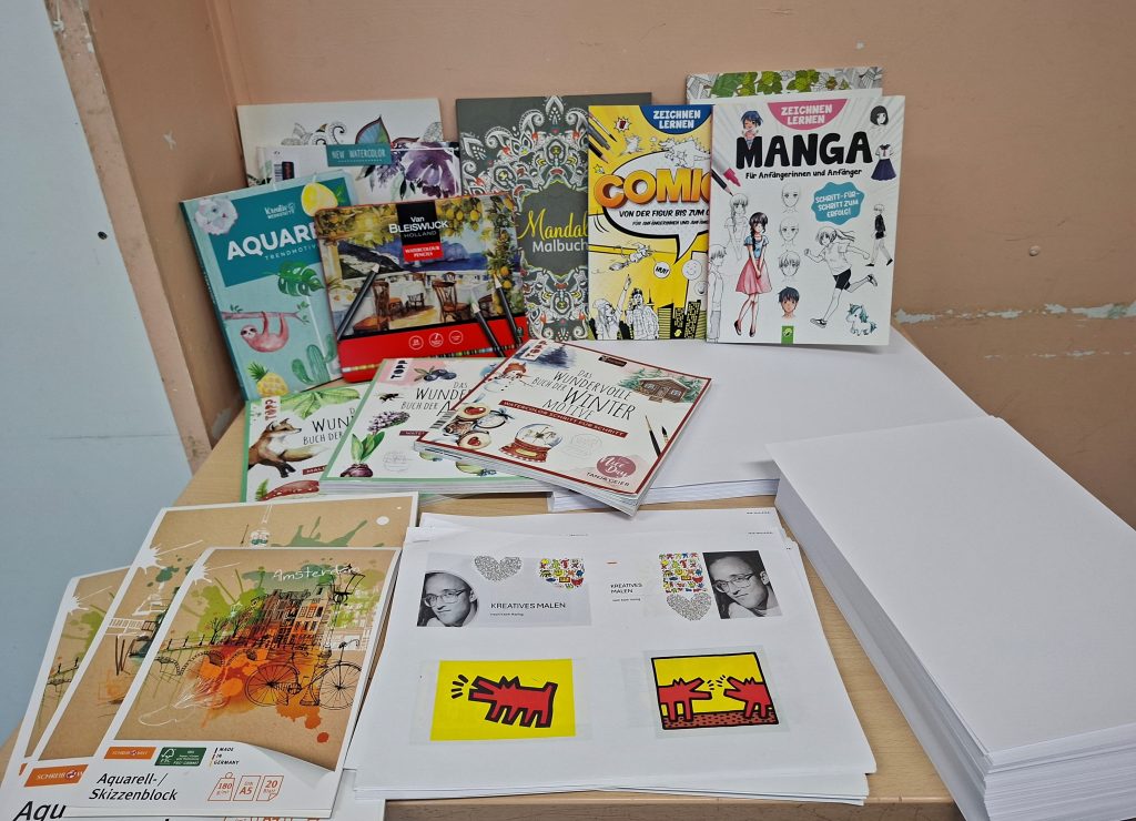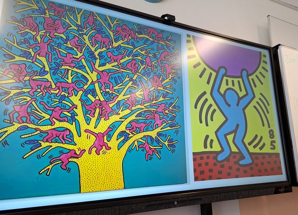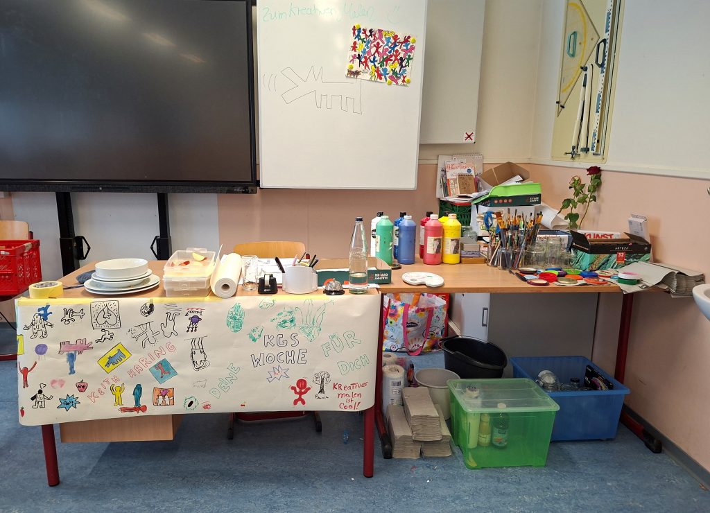 Beim Kreativen Malen nach Keith Haring, von dem die Fotos stammen, konnten die Kinder und Jugendlichen Bilder mit Acryl (Nordlichter Landschaft) oder auch mit Aquarellfarben malen. Zudem wurde zu Beginn jeweils ein Kurzfilm über den Künstler gezeigt, der durch einfache Kreidezeichnungen auf schwarzem Untergrund in den New Yorker U Bahnstationen bekannt wurde.