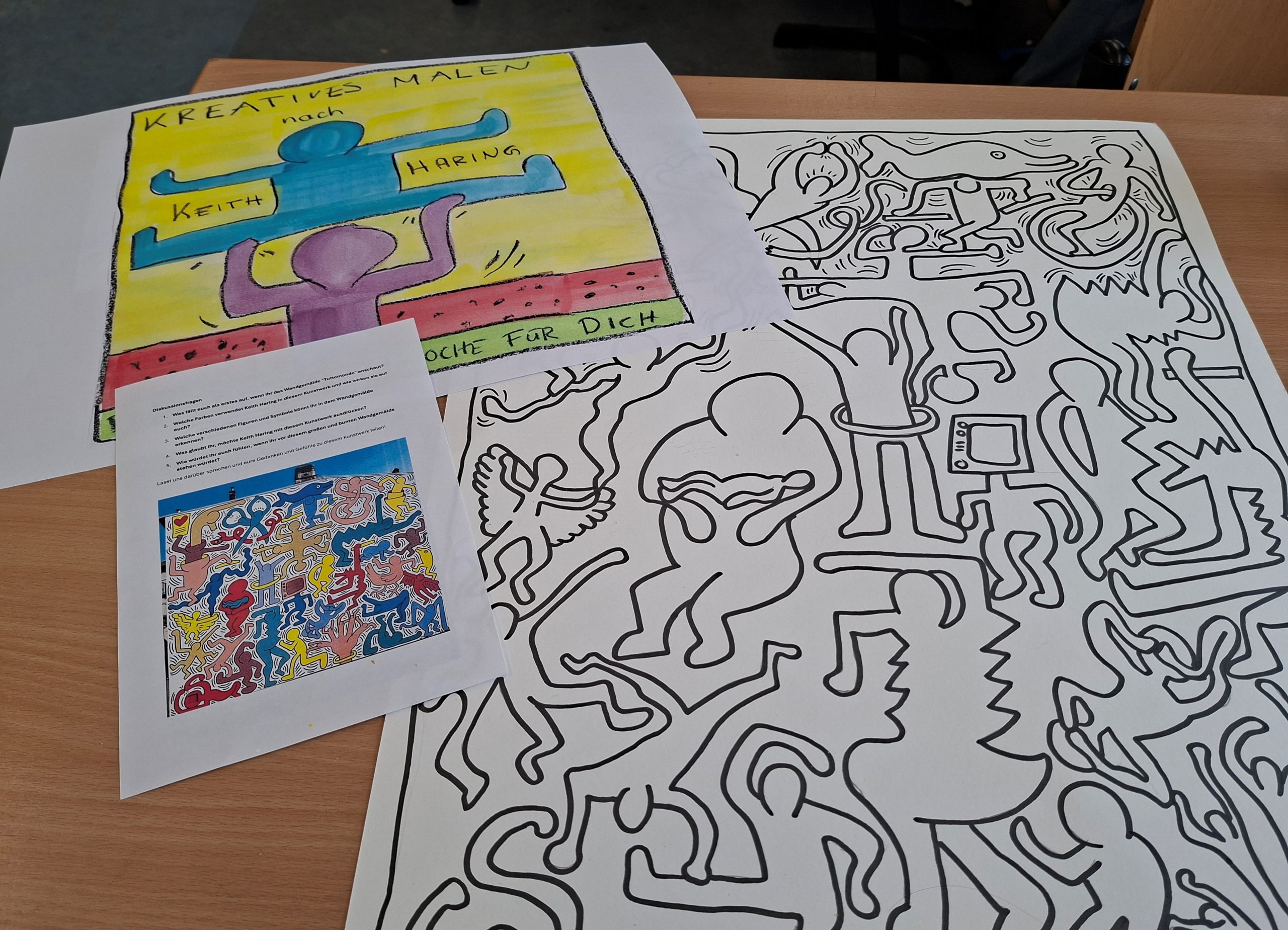 Beim Kreativen Malen nach Keith Haring, von dem die Fotos stammen, konnten die Kinder und Jugendlichen Bilder mit Acryl (Nordlichter Landschaft) oder auch mit Aquarellfarben malen. Zudem wurde zu Beginn jeweils ein Kurzfilm über den Künstler gezeigt, der durch einfache Kreidezeichnungen auf schwarzem Untergrund in den New Yorker U Bahnstationen bekannt wurde.