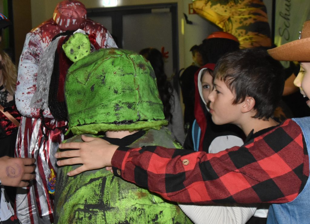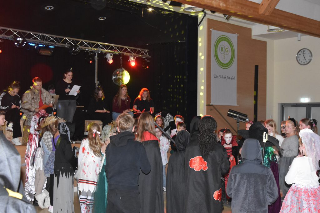 Es gab auch einen Kostümwettbewerb, zu dem man sich am Eingang beim Einlass einschreiben lassen konnte. Es waren sehr viele gruselige Kostüme, z.B. ein Dino, ein Horror Roboter, Horror Cheerleaderinnen, Hexen und noch vieles mehr. Die Jury des Kostümwettbewerbs bestand u.a. aus Vivien, Nike und Lara aus der SV, Herrn Kaluza und Herrn Dr. Pikos. Die Jury hat sich alle Bewerber angeschaut und bewertet. Den ersten Platz hat Pepe Lenthe als Horror Roboter belegt. Die Gewinner haben eine Medaille und einen Gutschein für GNH bekommen.