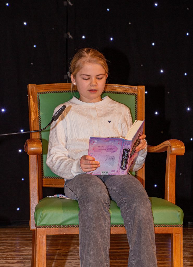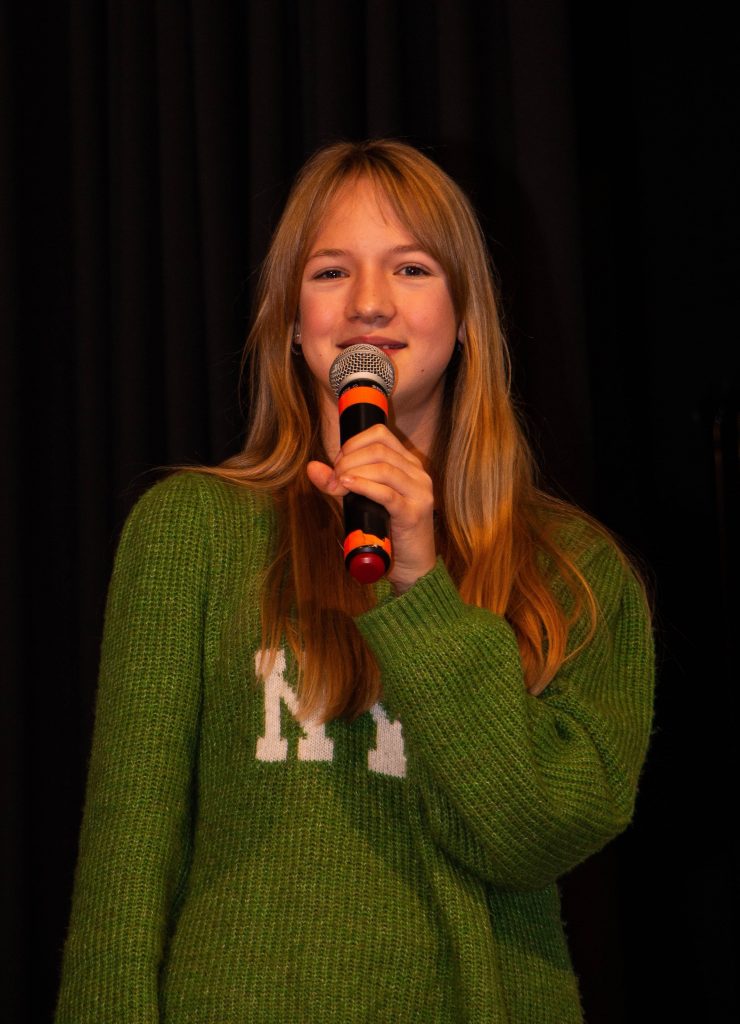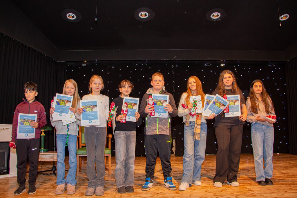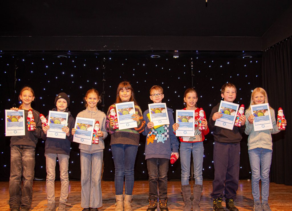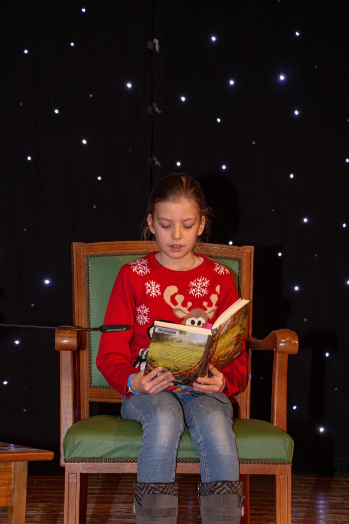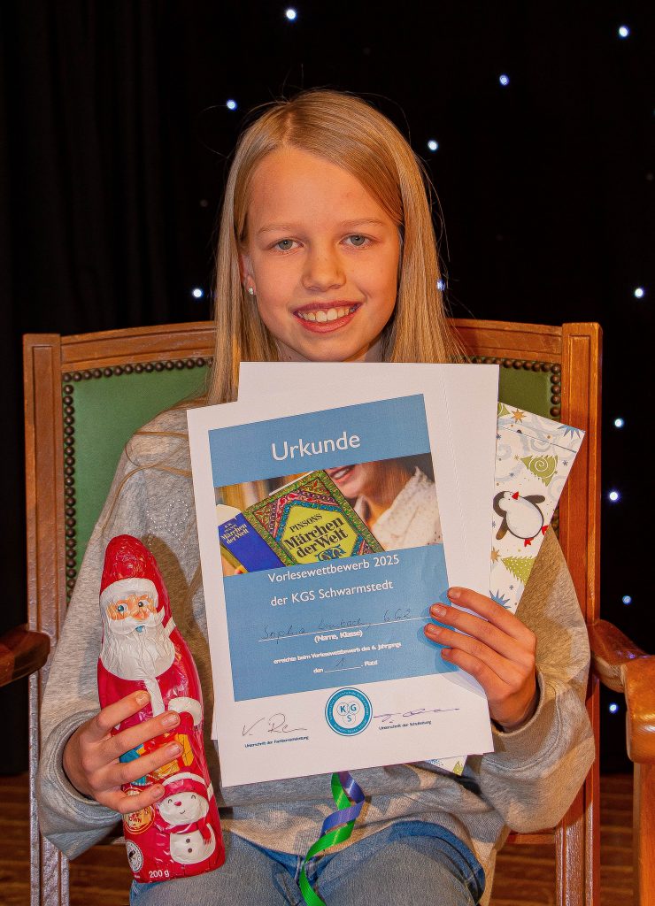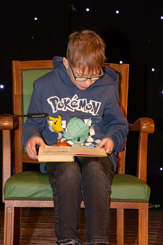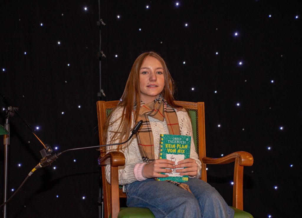 In den 5. Klassen traten Vertreter:innen aller Schulzweige an, um aus einem Buch ihrer Wahl vorzulesen. Sie hatten sich vorher in einem Klasseninternen Wettbewerb durchgesetzt. Für alle war es sicher etwas Neues, vor so vielen Mitschüler:innen auf der Bühne mit Mikrofon zu sprechen. Aber sie meisterten es gut und erhielten zum Ende der Veranstaltung alle eine Urkunde, einen großen Schokoladenweihnachtsmann und eine individuelle Bewertung, die von einer Jury aus älteren Schülerinnen und Lehrkräften verfasst worden war. Überreicht wurden die Urkunden von Anna Sophie Puchinger, die den Wettbewerb des 6. Jahrgangs im letzten Jahr gewonnen hatte; sie unterstützte damit Kathrin Remmers und die beiden Moderatorinnen Charlott Heinrich und Kim Mümmler aus dem 13. Jahrgang.