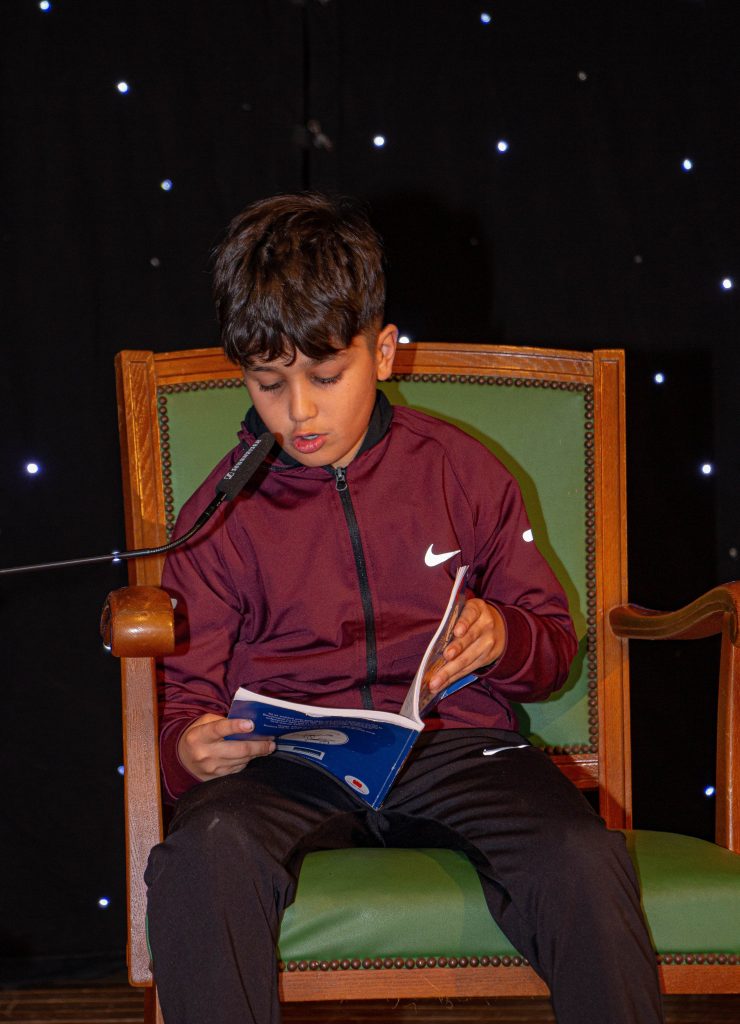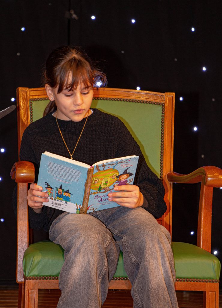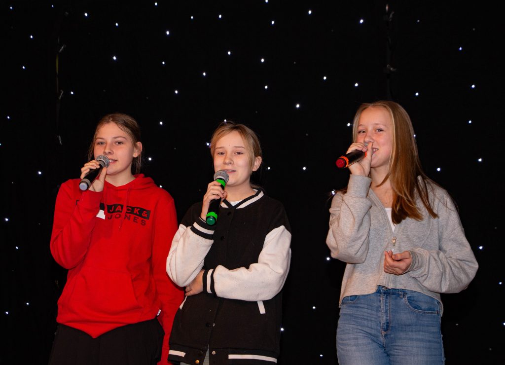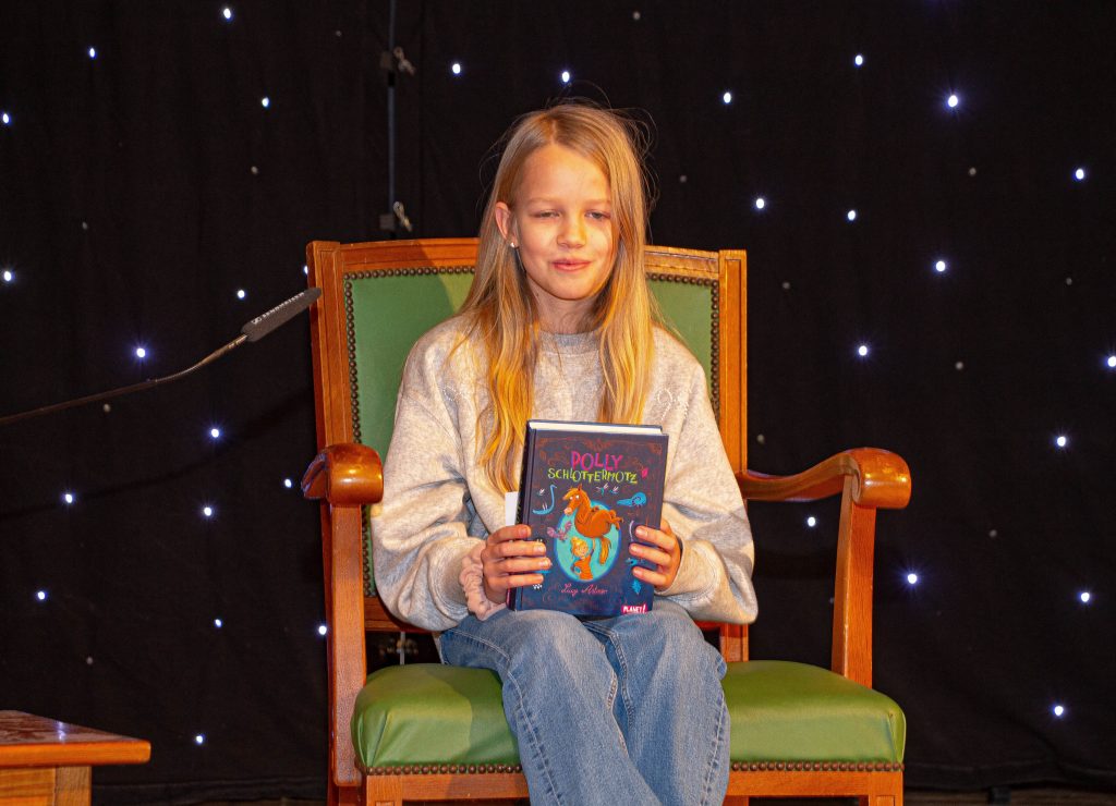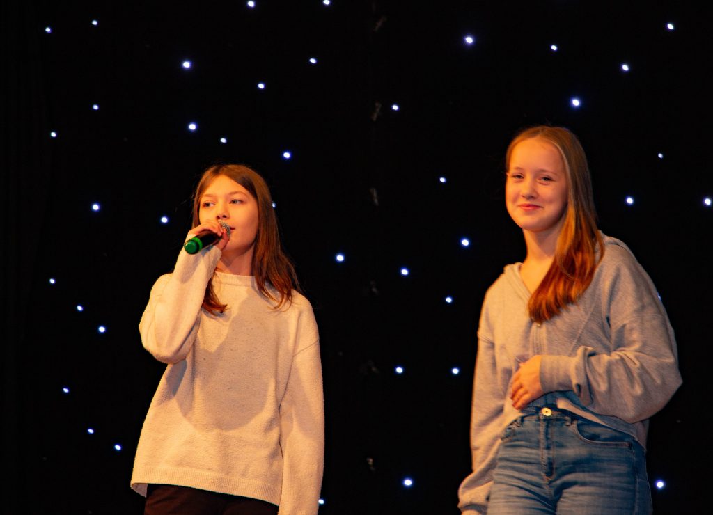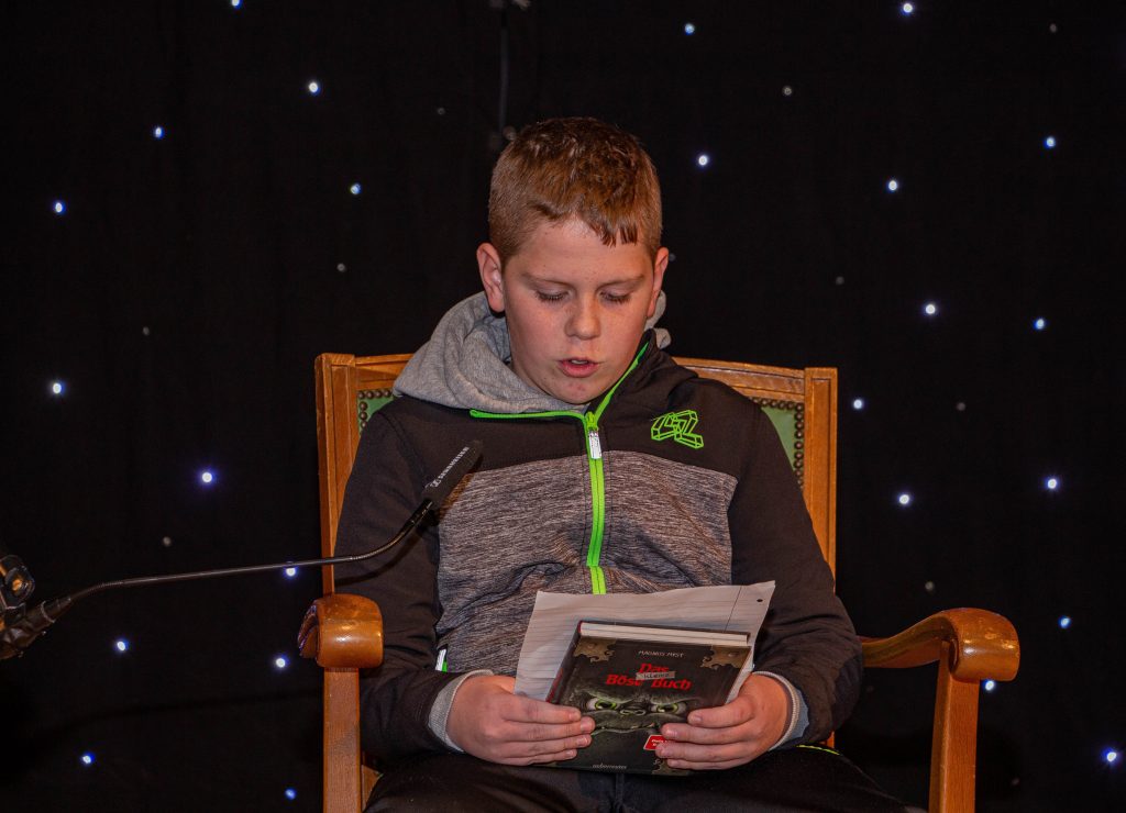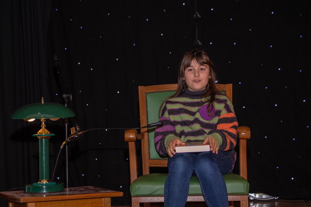 In den 5. Klassen traten Vertreter:innen aller Schulzweige an, um aus einem Buch ihrer Wahl vorzulesen. Sie hatten sich vorher in einem Klasseninternen Wettbewerb durchgesetzt. Für alle war es sicher etwas Neues, vor so vielen Mitschüler:innen auf der Bühne mit Mikrofon zu sprechen. Aber sie meisterten es gut und erhielten zum Ende der Veranstaltung alle eine Urkunde, einen großen Schokoladenweihnachtsmann und eine individuelle Bewertung, die von einer Jury aus älteren Schülerinnen und Lehrkräften verfasst worden war. Überreicht wurden die Urkunden von Anna Sophie Puchinger, die den Wettbewerb des 6. Jahrgangs im letzten Jahr gewonnen hatte; sie unterstützte damit Kathrin Remmers und die beiden Moderatorinnen Charlott Heinrich und Kim Mümmler aus dem 13. Jahrgang.