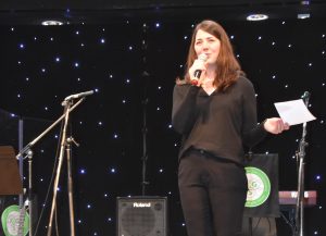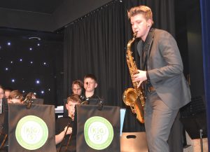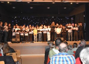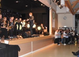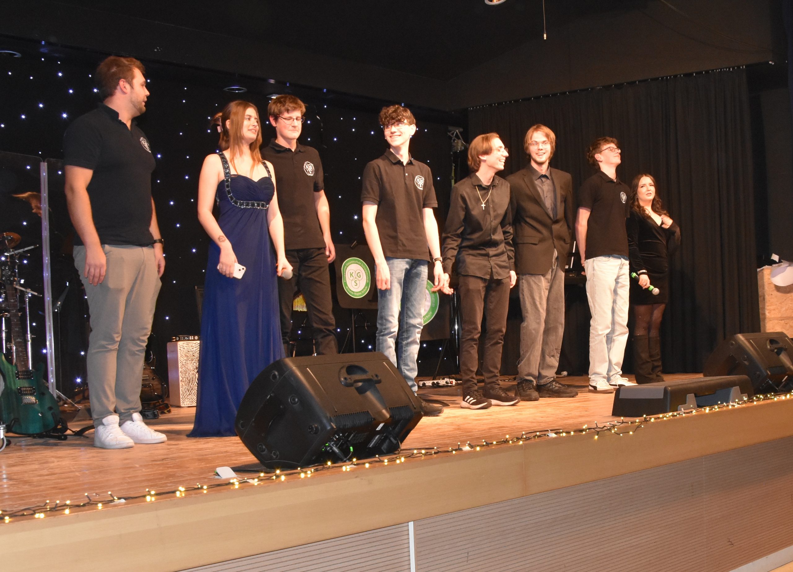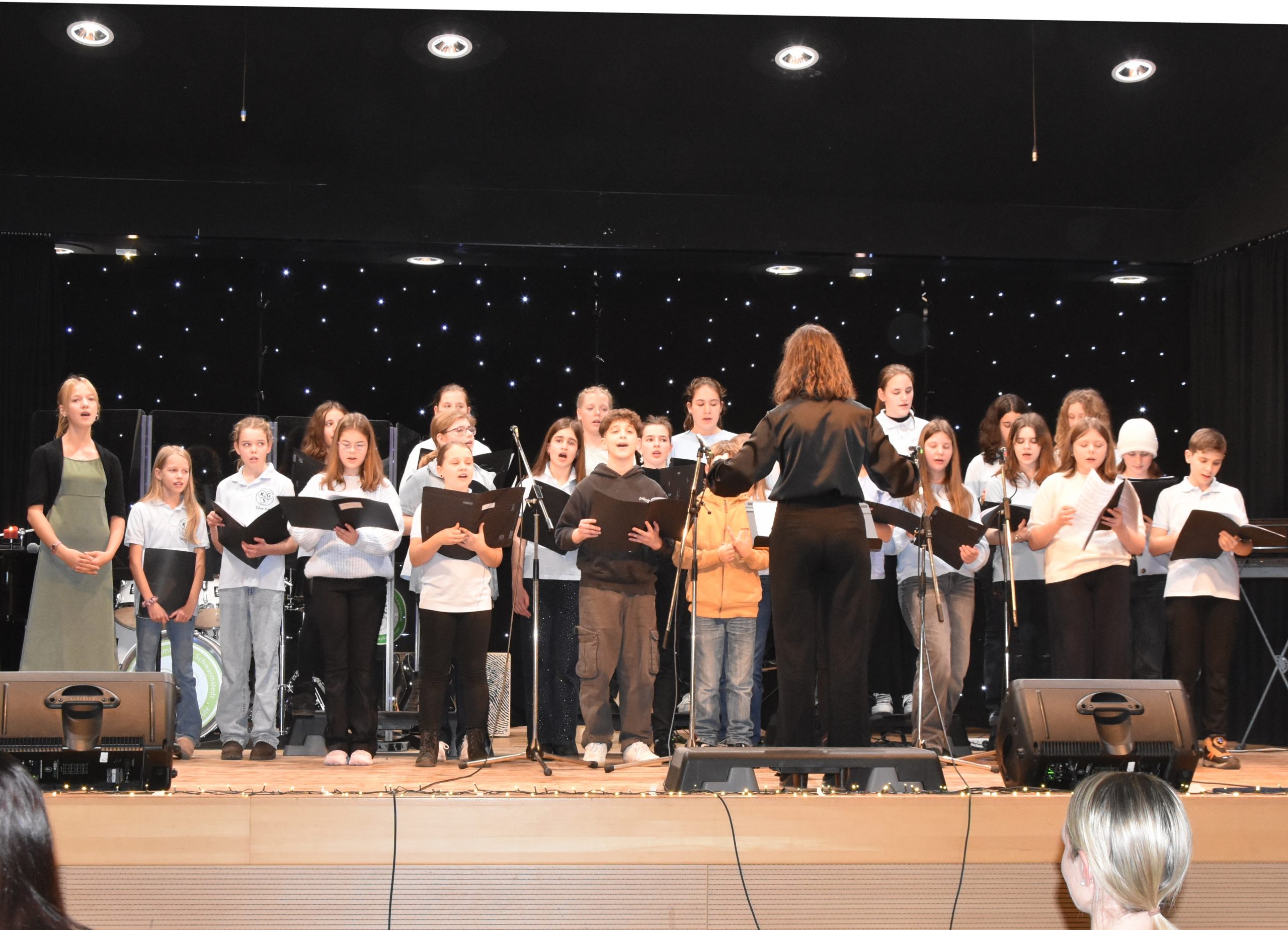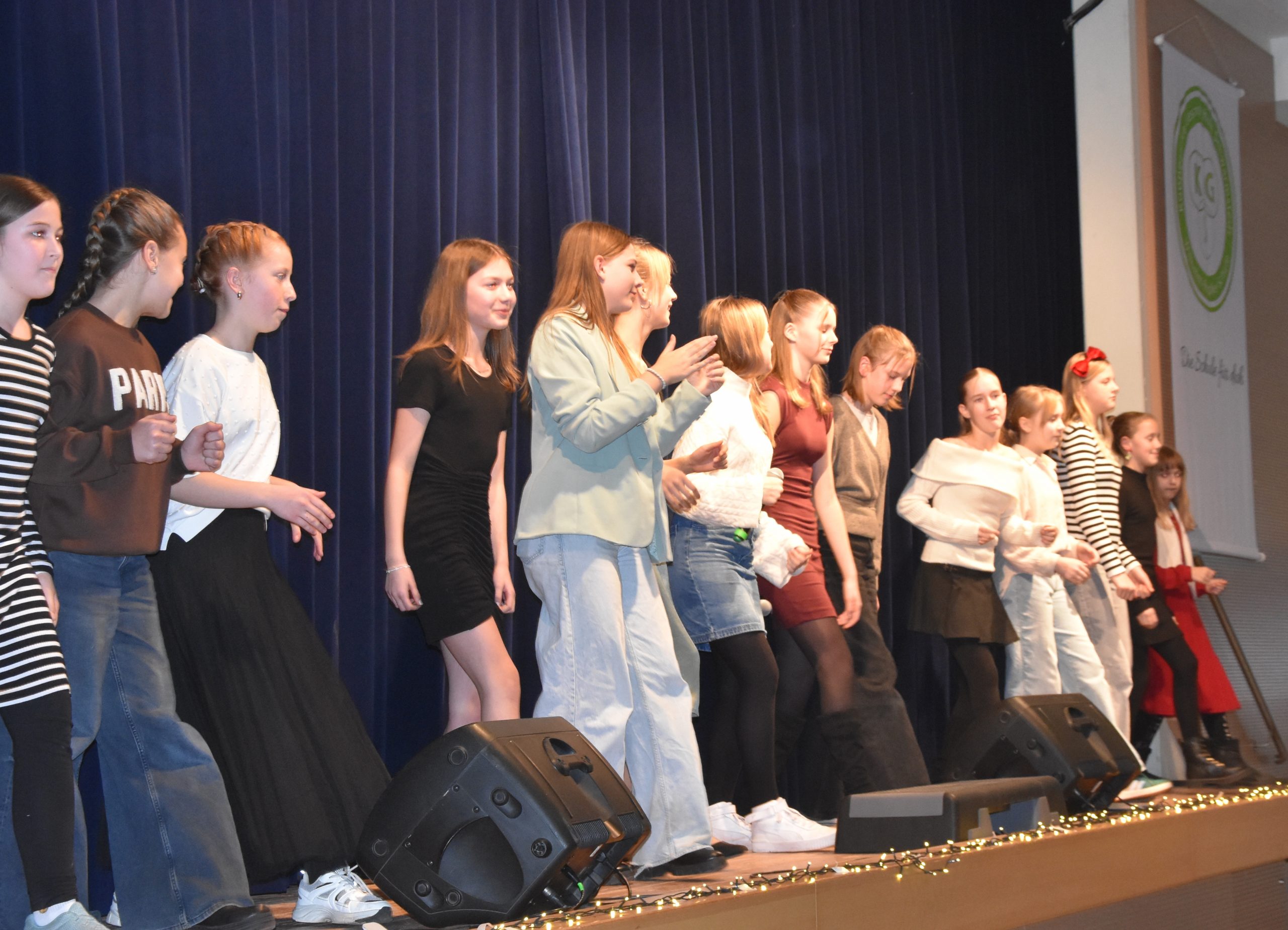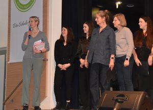In der 15 minütigen Pause verkauften Schüler:innen aus dem 12. Jahrgang unter dem Dach des Ehemaligenvereins Getränke und Snacks und verdienten damit schon einmal Geld für ihren Abiball. Nach der Pause startete die Schulband wieder mit einem fulminanten Auftritt und präsentierte gewohnt professionell drei Titel. Bemerkenswert hierbei, dass neben der auch aus dem Fernsehen bekannten Madelene Hulm (The Voice Kids) bei diesem Konzert Cora Hemmerle an ihrer Seite stand. Liara Stahl, die zur Stammbesetzung der Schulband gehört, hatte sich leider kurzfristig krankmelden müssen und Cora sprang ein. Man merkte es daran, dass sie das ein oder andere Mal auf dem Handy vergewisserte. Aber, es gelang ihr perfekt, im Wechsel und gemeinsam mit Madelene abzuliefern. Madelene nahm sie am Ende der Präsentation erleichtert in die Arme und die ganze Band und ihr Leiter Marcel Kaluza waren froh über diese tolle Leistung. Genauso bemerkenswert war anschließend Anna Puchinger, die sich nach diesem Power Auftritt ganz allein auf die Bühne stellte und das Publikum mit ihrer wunderbaren Stimme verzauberte. Anna besucht erst die 7. Klasse und ist in der Sing-AG von Frau Dumke, aber mutig und stimmgewaltig wie ein Profi. Sie blieb dann auch gleich auf der Bühne, da die Sing-AG im Anschluss einen weiteren tollen Auftritt mit einem Mitmachklatscher hatte, bei dem das Publikum begeistert mitmachte. Dann kam die Big Band unter der Leitung von Vinn Rübke auf die Bühne und hat natürlich einen richtig guten Auftritt gehabt, so wie man das von ihnen kennt. Marlies Weymann als Solosängerin, Gesa Bauer am Flügel und Vinn Rüpke am Saxophon zeigten zudem, dass sie nicht nur dirigieren können, sondern auch selbst top sind. Eine besondere Herausforderung für das Technik Team des Schulassistenten Thomas Sauer, denn beim nächsten Akt blieb die Big Band auf der Bühne und die beiden Chöre sangen dazu an Mikrofonen vor der Bühne; nur so war für alle Platz. Ganz zum Schluss, als Überraschung, trat der Projektchor auf. Er wurde in Zusammenarbeit von Frau Bauer, Frau Weymann, Maike Blum und Herrn Rübke speziell für dieses Konzert zusammengestellt. Neben allen anderen Sänger:innen kamen jetzt noch einige Lehrer:innen mit auf die Bühne und unterstützten den Gesang – ein grandioser Abschluss eines bemerkenswerten Abends. Das stellte auch Maren Engel heraus, die als Schulleitungsmitglied dem zahlreich erschienen Publikum, allen Akteuren und besonders den Musiklehrer:innen für dieses tolle Konzert dankte.