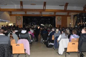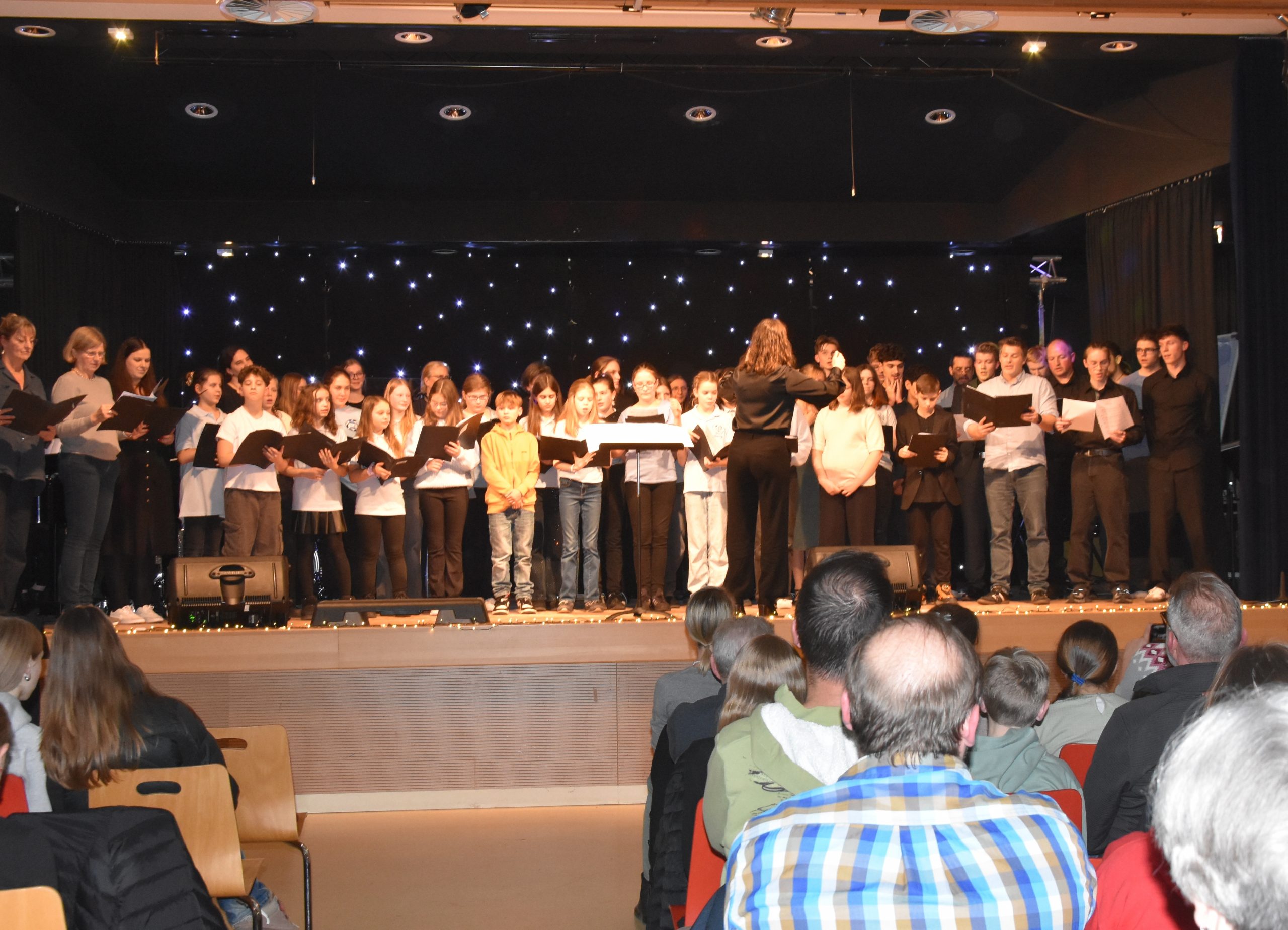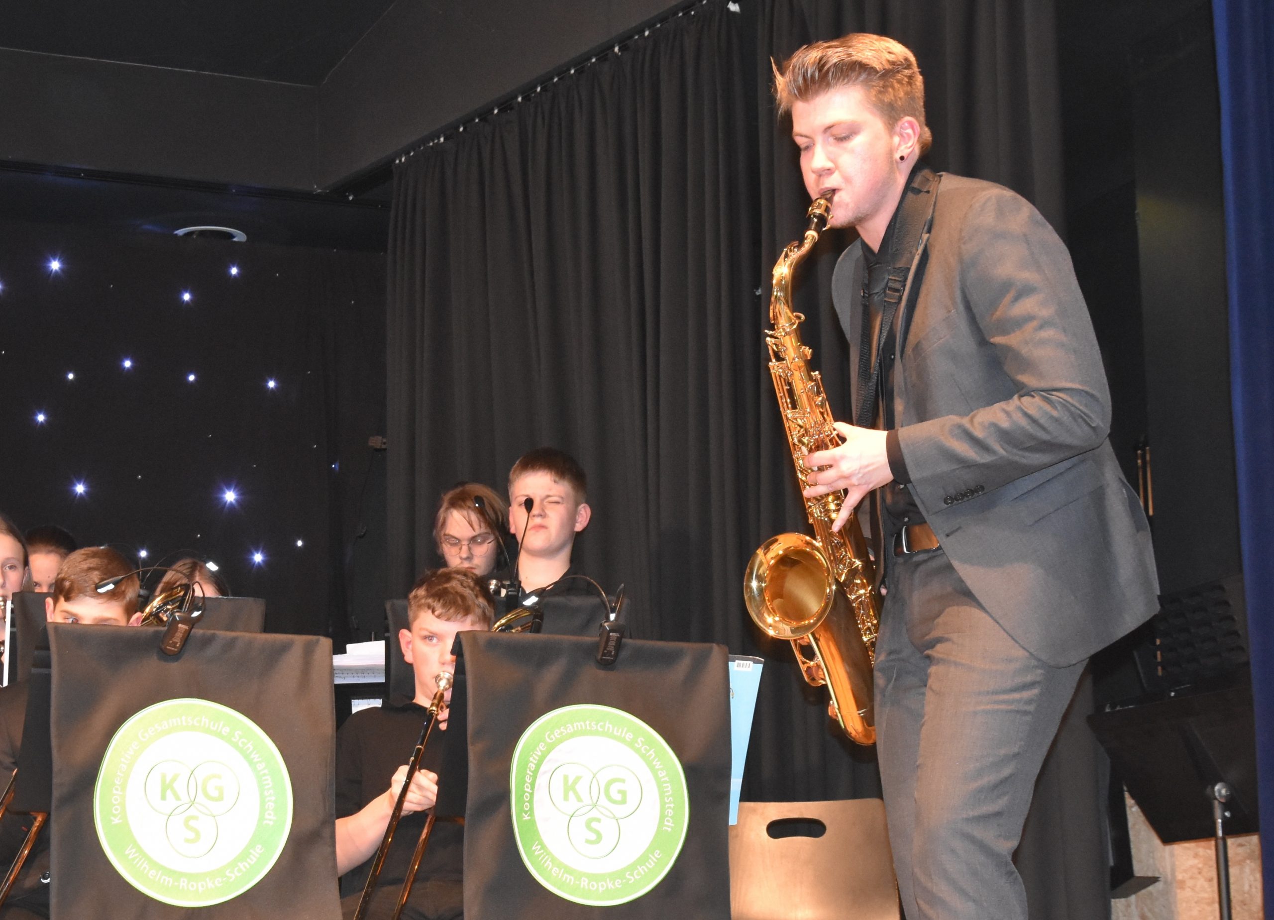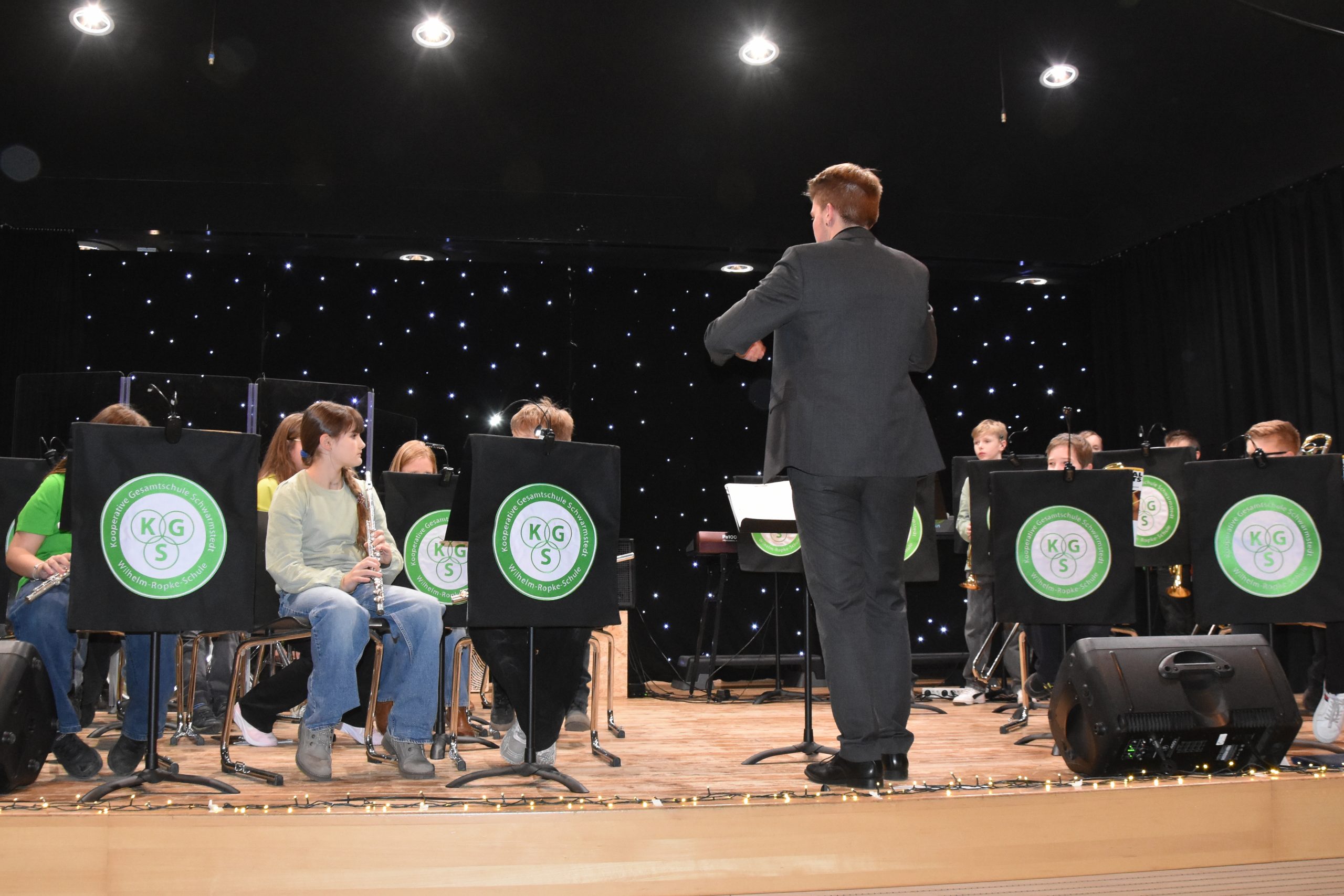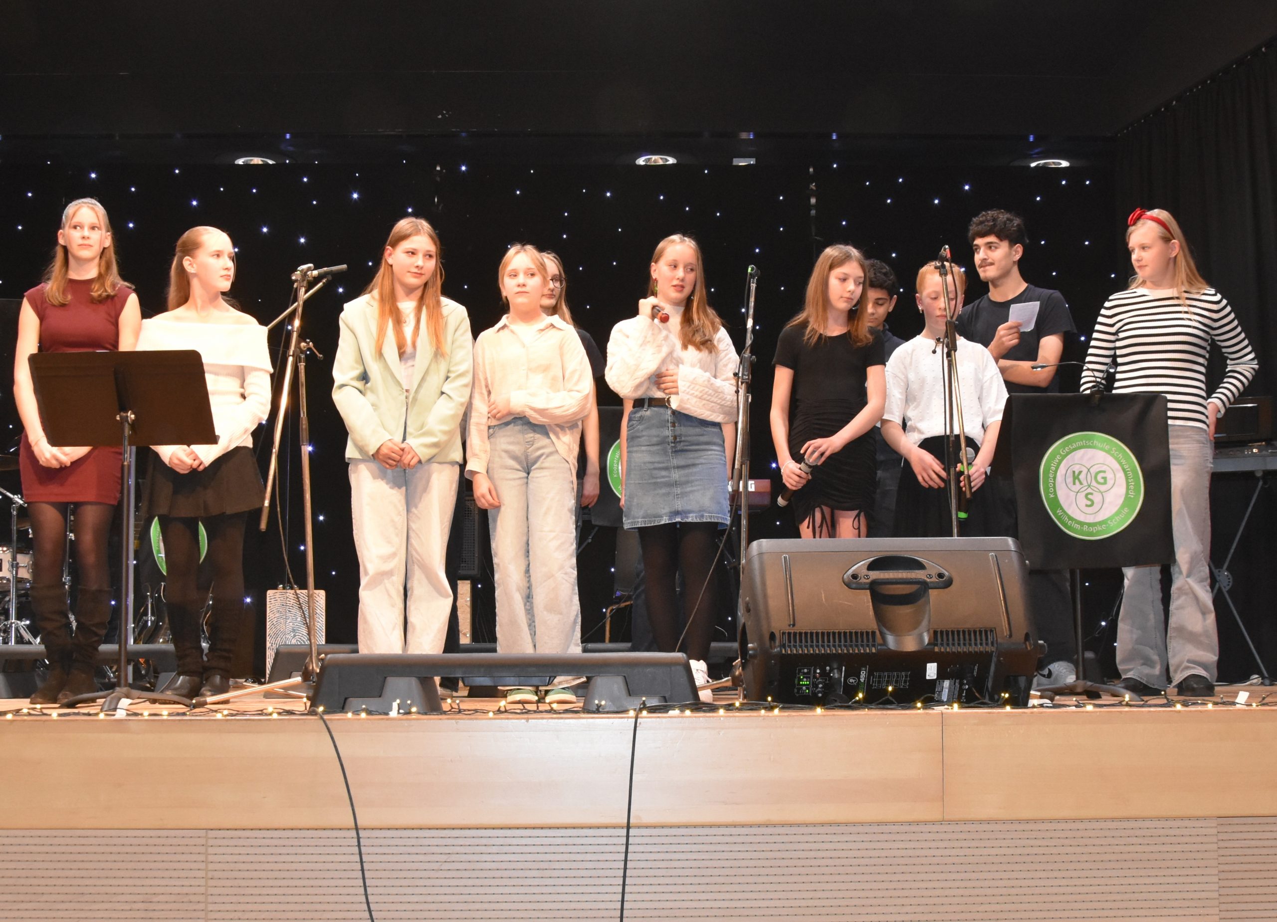Eine kleine Tradition ist das Weihnachtskonzert der Kooperativen Gesamtschule Schwarmstedt in der Mensa. In diesem Jahr kamen noch mehr Zuschauer als im Jahr zuvor, so dass auf die Schnelle zusätzliche Stühle aufgestellt werden mussten. Die Zuschauer werden es nicht bereut haben, es war ein tolles Konzert. Nach der Begrüßung durch Lara Schmidt, die an diesem Abend durch das Programm führte, hat die Bläsergruppe von Vinn Rübke gespielt, der erste Auftritt der neuen 5. Klasse und schon ein Genuss. Direkt danach haben aus der Sing-AG unter der Leitung von Nicole Dumke Nina Bloemberg und Celine Friedrich sehr schön gesungen. Die beiden sind Bühnenerprobt, aber die Leistung zu zweit vor so einem großen Publikum zu singen, ist gar nicht hoch genug anzuerkennen. Im Anschluss kam dann die Bläsergruppe der 6. Klassen, die auch von Herrn Rübke geleitet wird. Auch sie überzeugten komplett; einige Talente spielten später sogar in der Big Band mit. Anschließend kamen dann wieder aus der Sing-AG Selina Maibach und Lia Friesen und boten einen tollen Auftritt. Gleich darauf füllte sich die Bühne, der Chor I mit jüngeren Schüler:innen aus den 5. – 8. Klassen kam auf die Bühne und hatte unter der Leitung von Gesa Bauer einen richtig tollen Auftritt. Selina Maibach hat dann zusammen mit Lisa Engehausen ein weiteres Lied perfekt vorgetragen, bevor der Chor II mit Schüler:innen aus den höheren Klassen gemeinsam mit der Sing – AG unter der Leitung von Marlies Weymann wunderbar weitermachte. Vor der Pause forderte Frau Weymann das Publikum auf, beim Lied „Oh, Tannenbaum“ kräftig mitzusingen. Da viele nur die erste Strophe kennen, waren vor dem Konzert Textzettel verteilt worden und das klangt dann auch richtig gut.